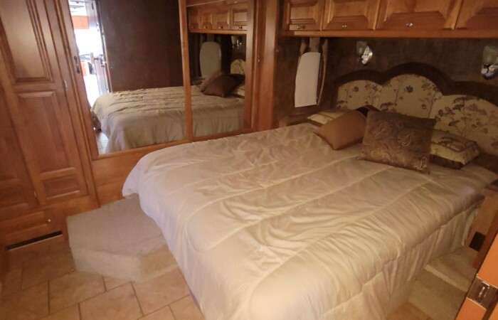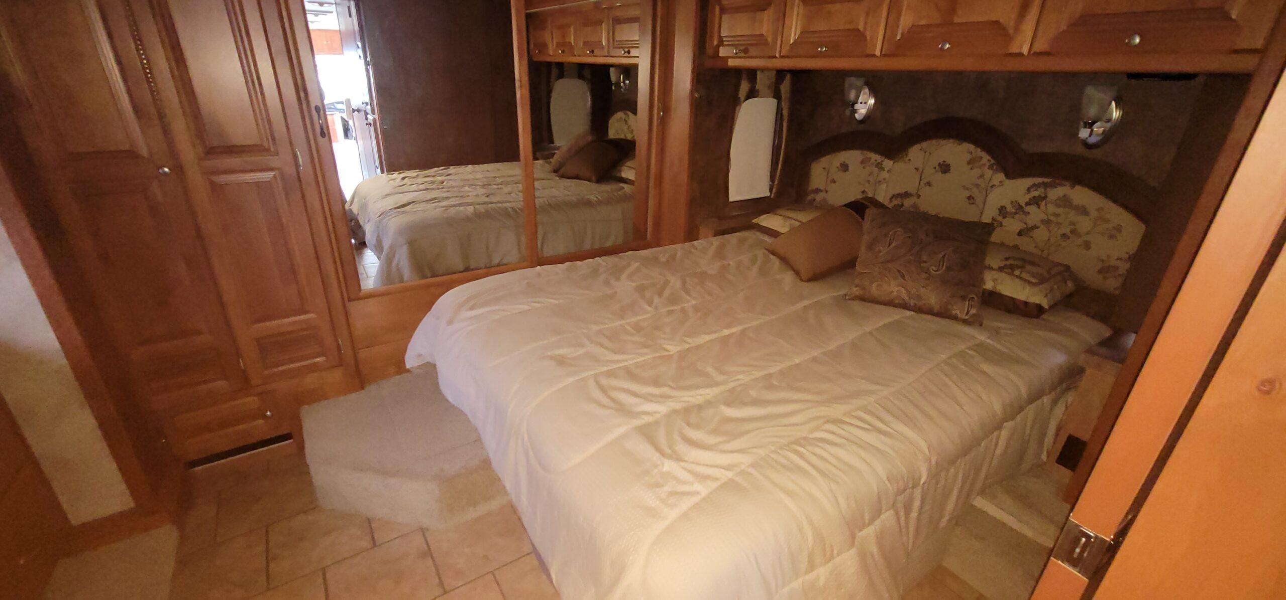 🛏 Rear Master Suite – Queen bed, wardrobe, large dresser, and solid wood cabinetry.