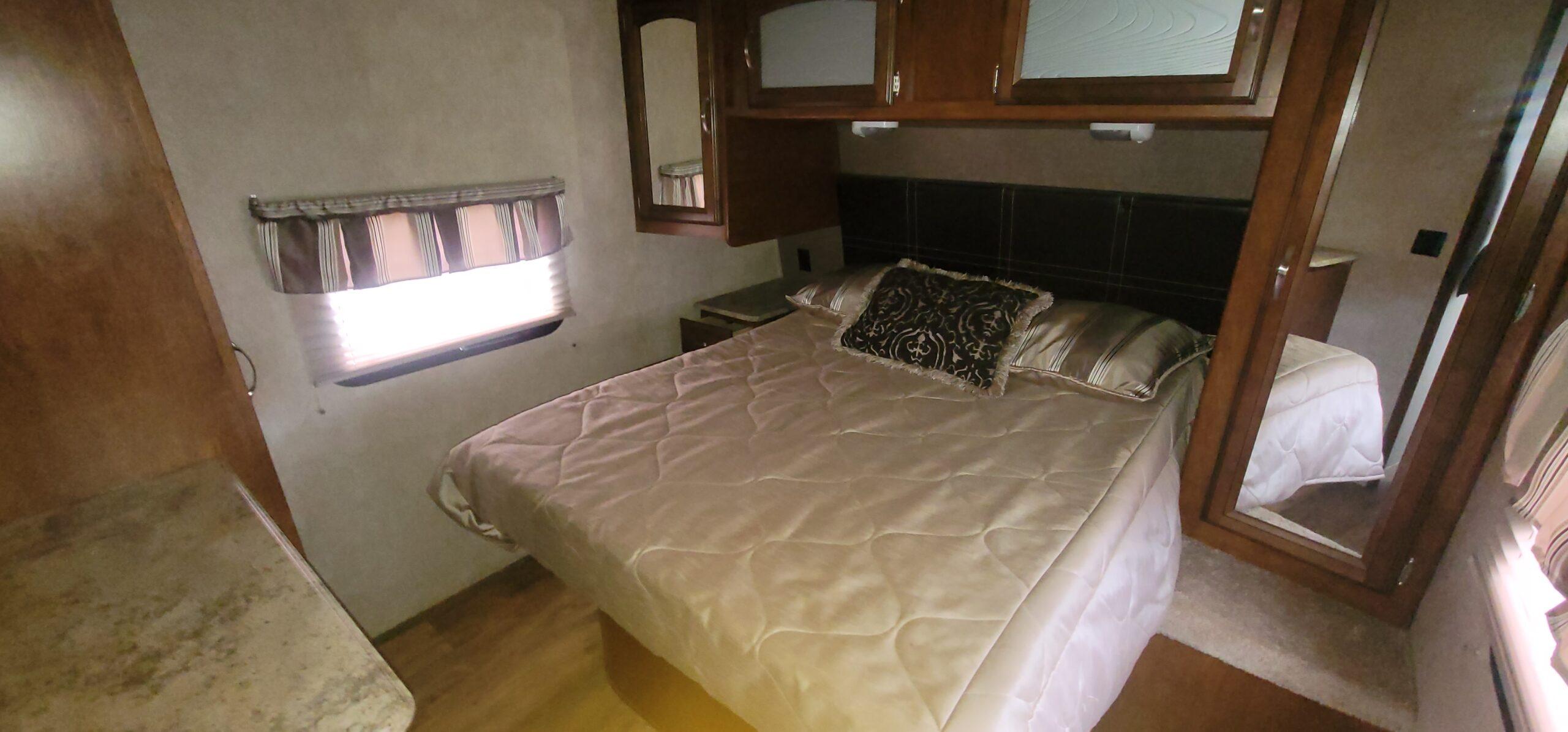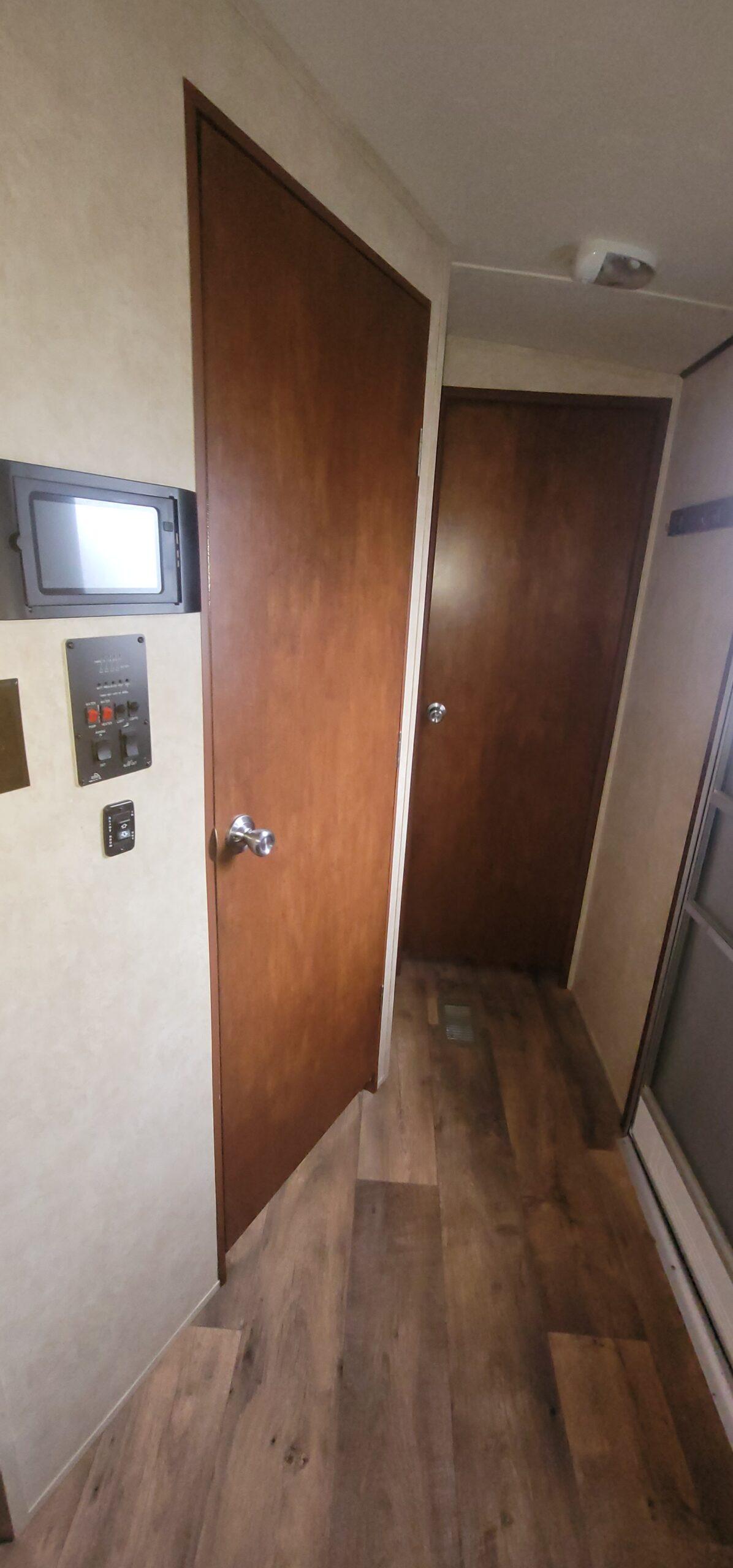 Private Master Bedroom: At the front of the trailer, the queen-sized bed is surrounded by storage compartments for clothes and gear, offering a restful night’s sleep. The bedroom is designed for comfort and privacy, with a solid door separating it from the living space.
