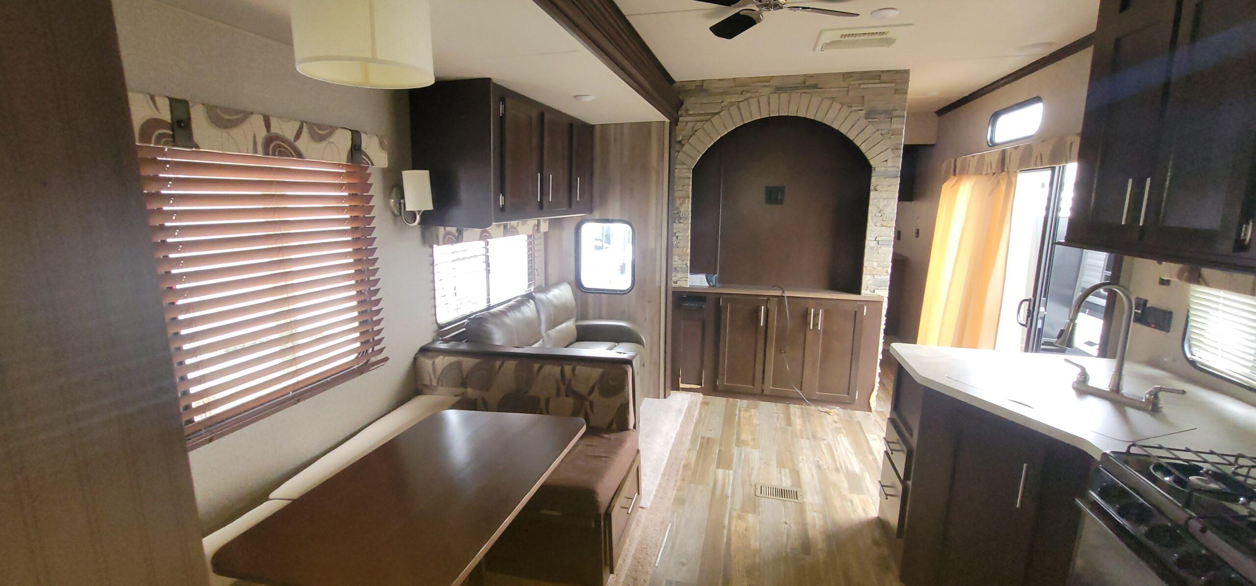 Open Living Area: The main living space includes a large slide-out that expands the interior, creating a spacious, open layout. A comfortable sofa and U-shaped dinette provide plenty of seating for dining, watching TV, or simply relaxing.