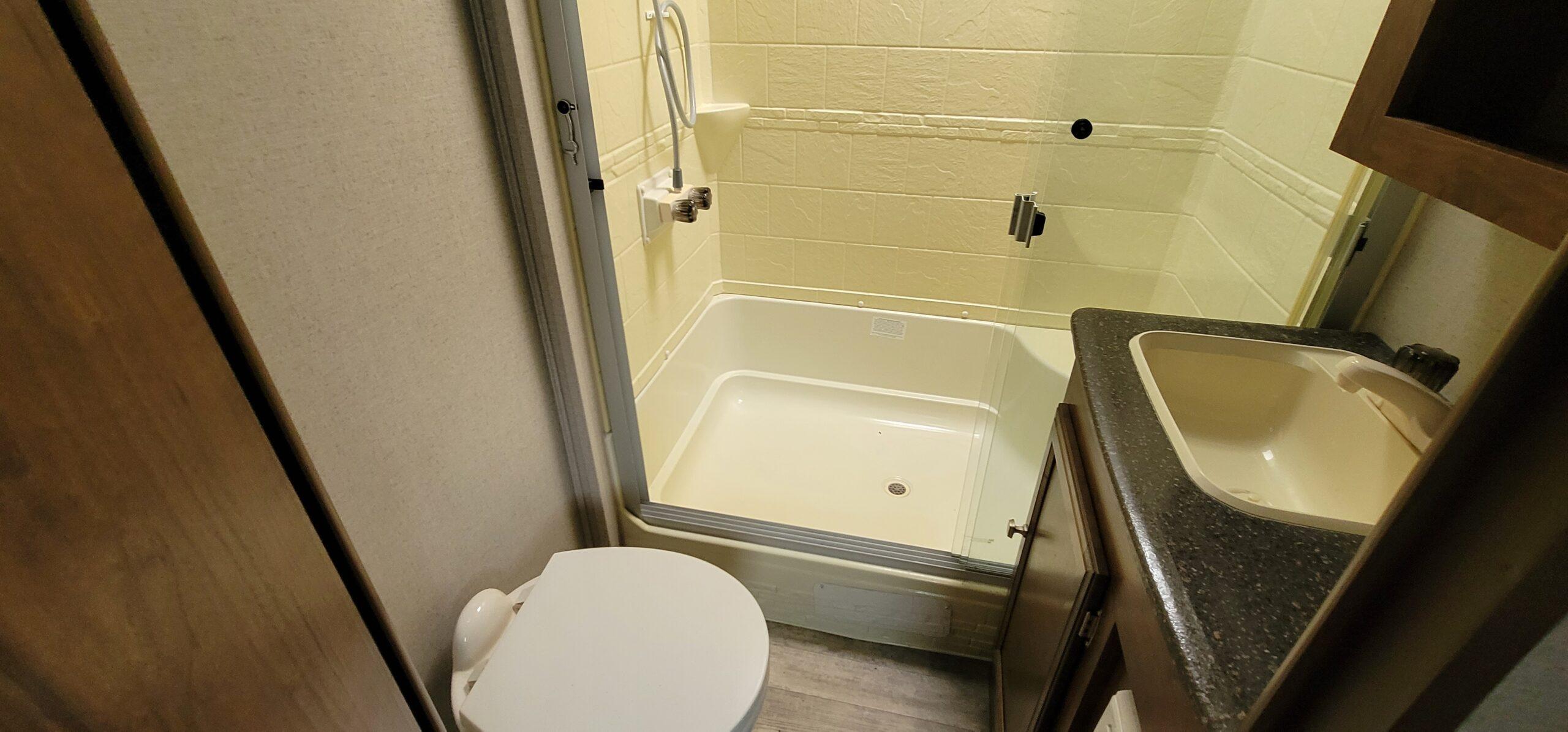 🚿 Full Bathroom – Walk-in radius shower, vanity, linen storage, and foot-flush toilet.
