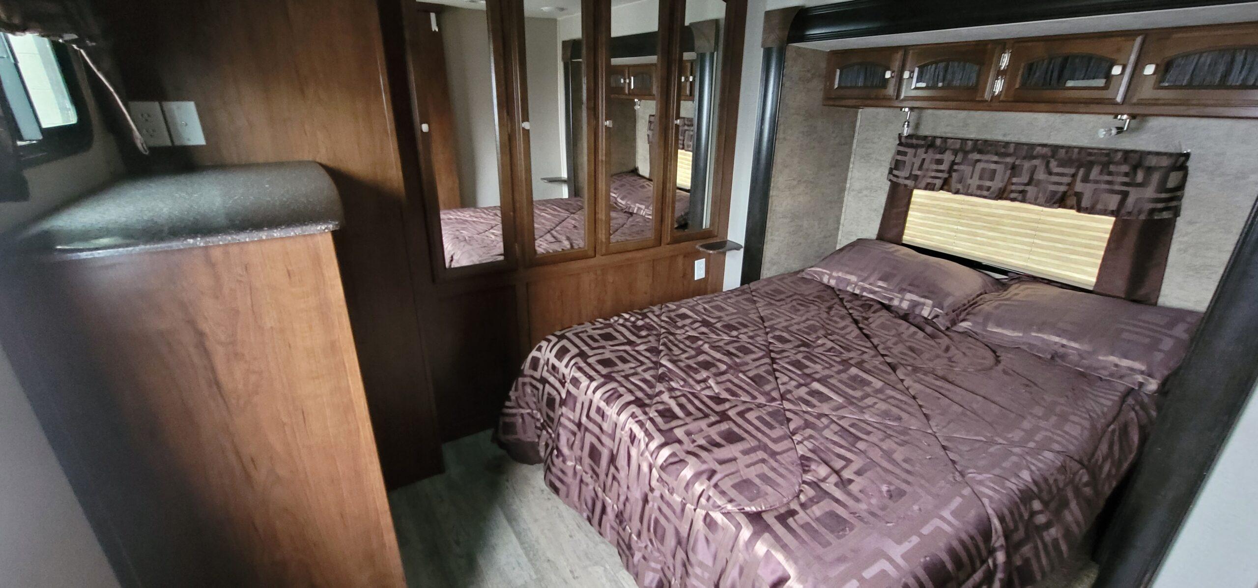 🛏 Rear Master Suite – Queen bed with slide-out, full wardrobe, dresser, and its own entry door.
