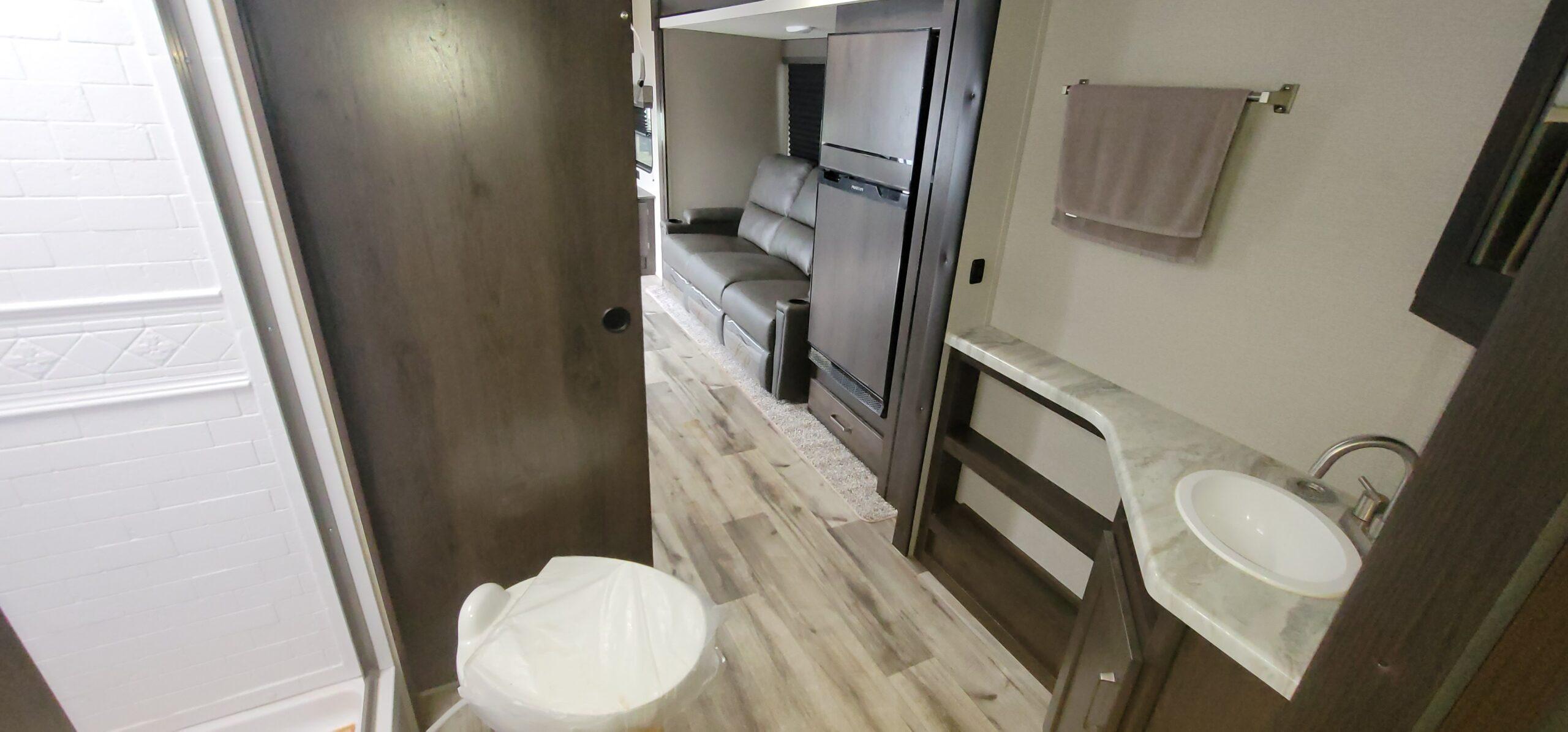 Walk-Through Full Bath: Convenient dual access from both the main living area and the bedroom, featuring a roomy walk-in shower and ample cabinetry. Blue Compass RV+1