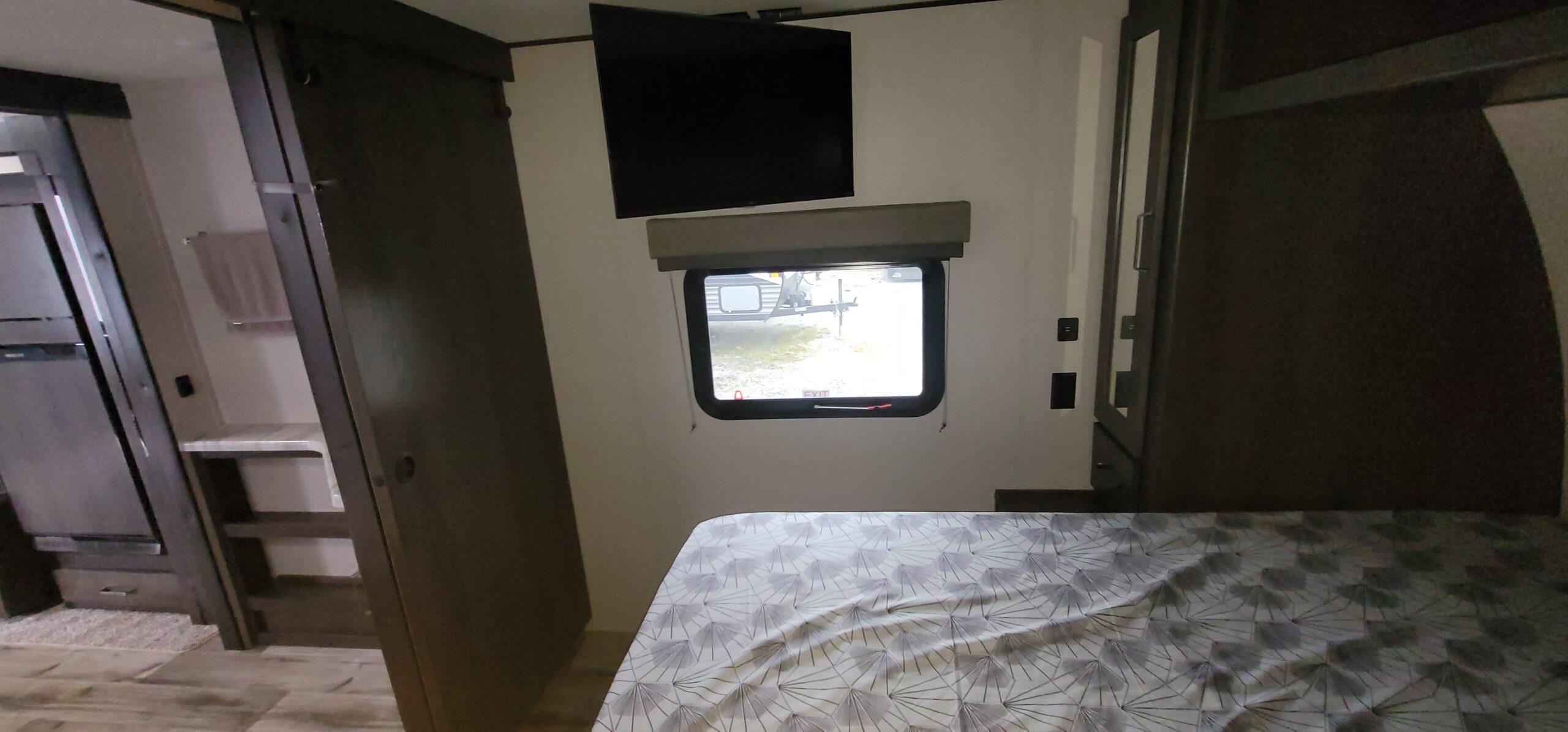 Front Master Suite: A private bedroom with a 60″ × 80″ queen bed, solid door for privacy, and storage beneath — perfect for restful nights. Greeneway RV Sales & Service