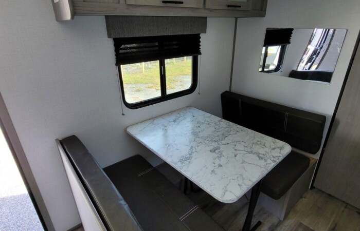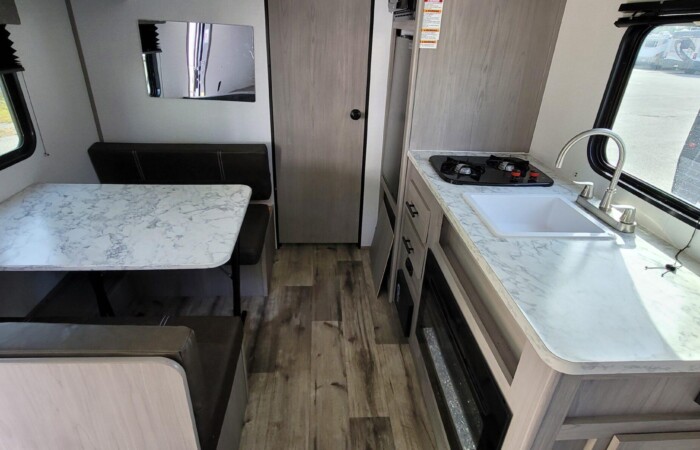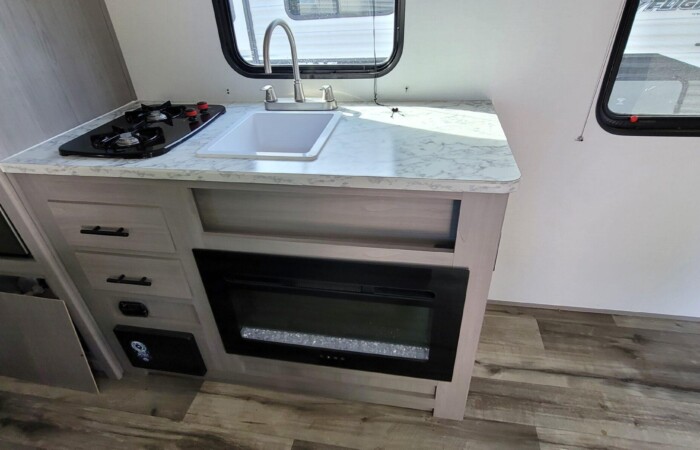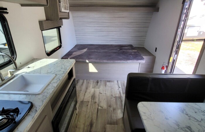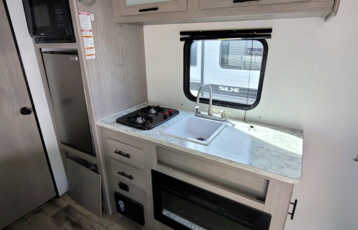 Inside, you’ll find a modern interior design with bright, clean finishes and efficient space usage. The convertible dinette and rear bed area provide plenty of sleeping room for family or friends. The full kitchen includes a refrigerator, microwave, cooktop, and sink — everything you need to make meals on the road.