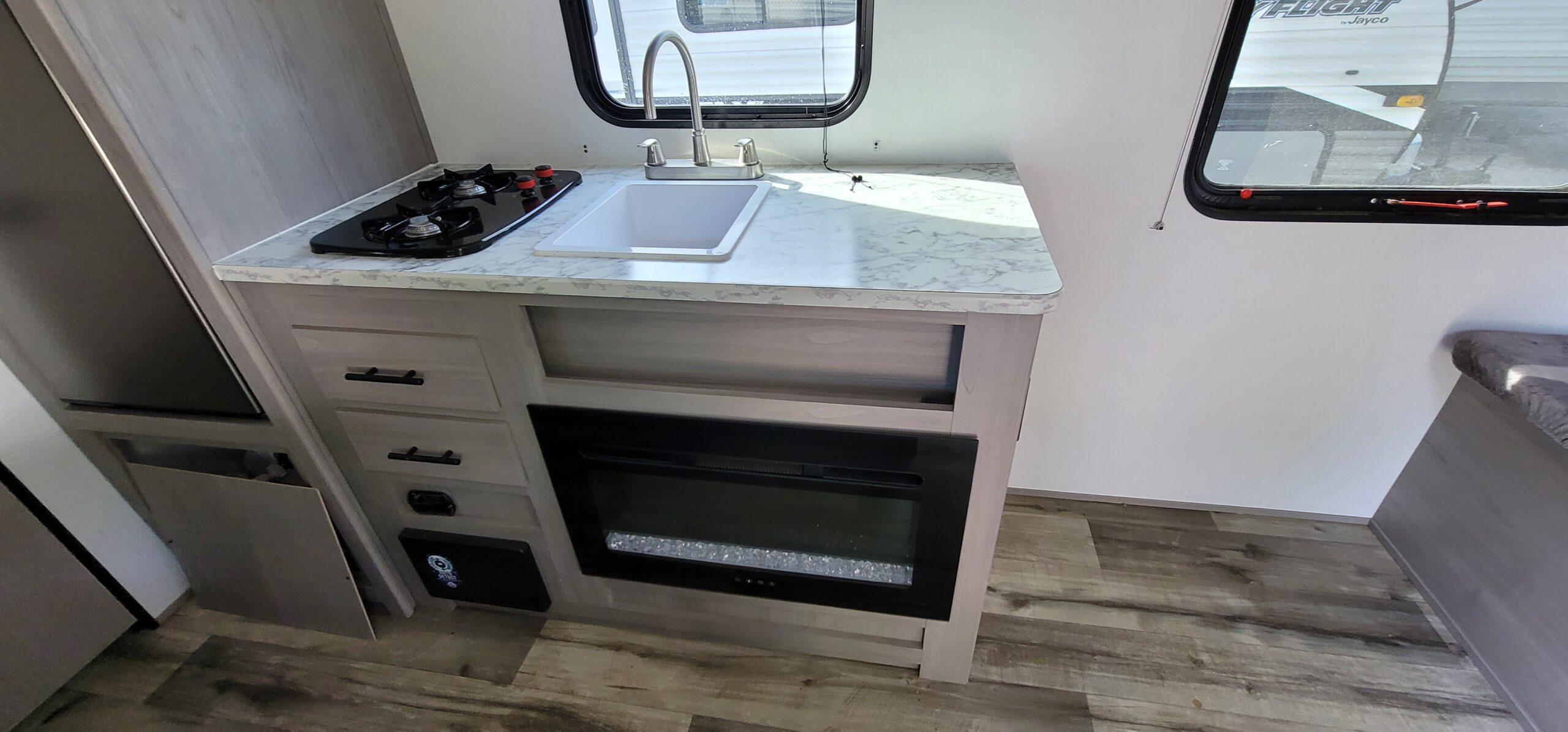 Inside, you’ll find a modern interior design with bright, clean finishes and efficient space usage. The convertible dinette and rear bed area provide plenty of sleeping room for family or friends. The full kitchen includes a refrigerator, microwave, cooktop, and sink — everything you need to make meals on the road.