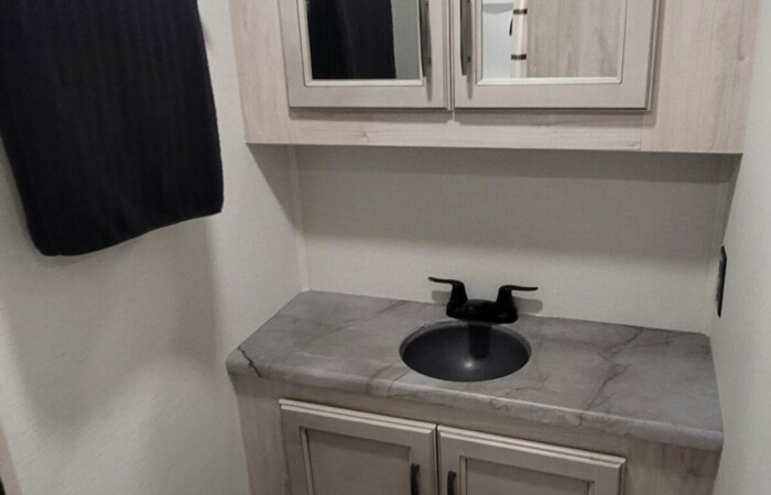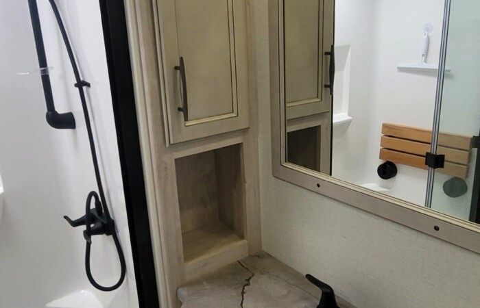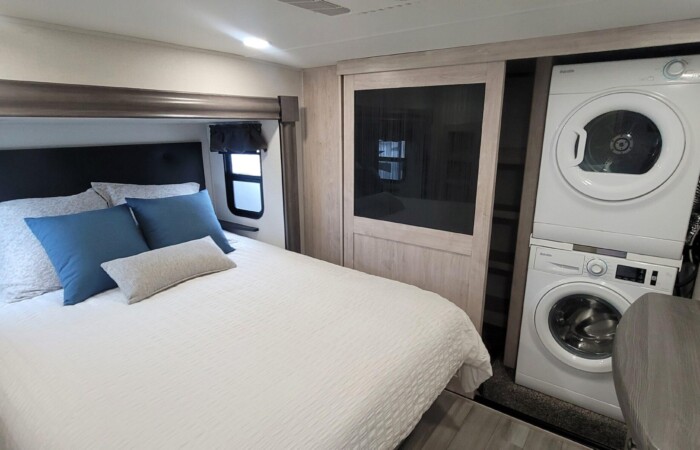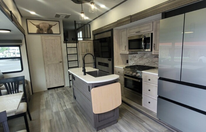 The 4002FB features a spacious front master suite with a king bed, walk-in wardrobe, and a huge front bathroom — complete with a double-sink vanity, walk-in shower, and even a stackable washer/dryer prep area. You’ll also find a second half bath mid-ship for guests or convenience while entertaining.